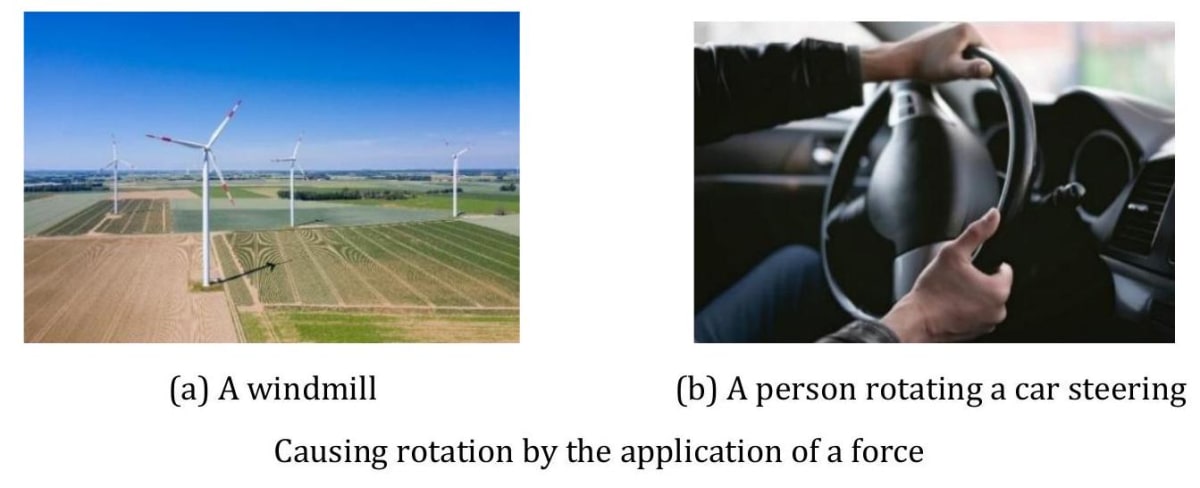 If an object (like a fan), is free to rotate about an axis, a force applied on it can cause its rotation. For example, force of wind causes a windmill to rotate [see figure (a)] ; a person driving a car rotates the steering through the force applied by his hands [see figure (b)].