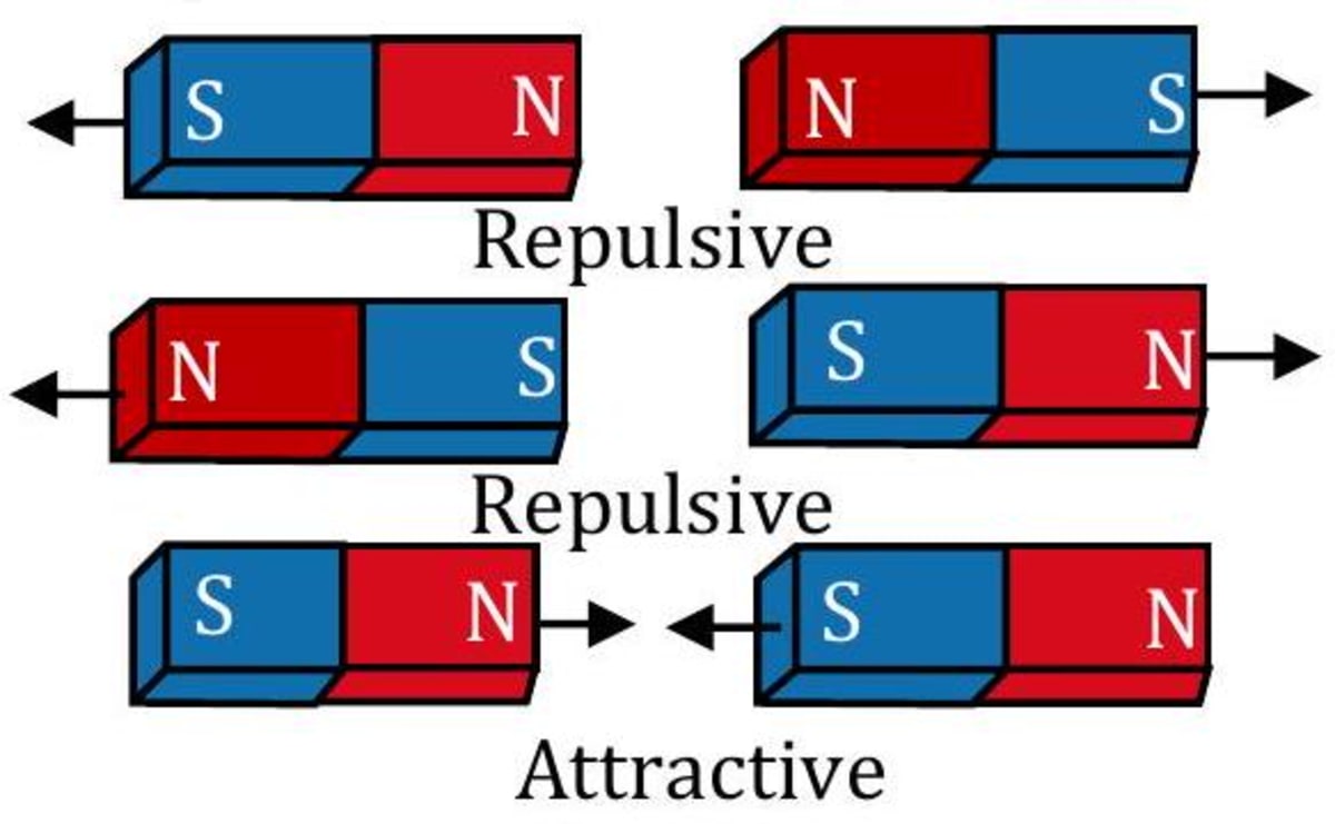 The force exerted by a magnet on a piece of iron or on another magnet is called magnetic force. Like (or similar) poles repel while unlike (or opposite) poles attract (see figure).