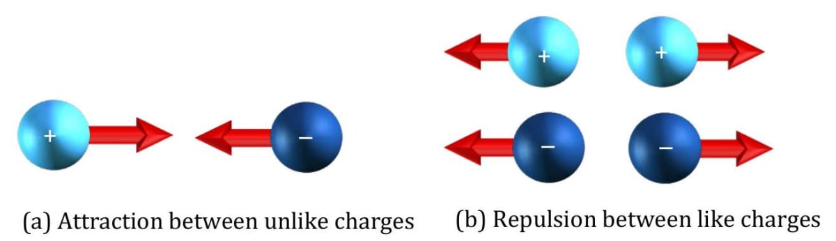 The electrons in an atom move around the nucleus. What keeps these electrons close to the nucleus? The positively charged protons in the nucleus exert an attractive force on the negatively charged electrons. All charged objects exert a force on each other. This force is called electrostatic force or electric force. The force exerted by a charged body on another charged body or uncharged body is known as electrostatic force. The electrostatic force between two charges can be attractive or repulsive (see figure). Objects with the same type of charge repel one another and objects with opposite charges attract one another i.e., 'like charges repel and unlike charges attract'.