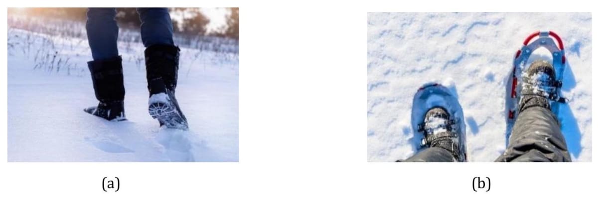 What happens when you walk on soft snow or dry sand? Your feet sink into the snow or sand and walking can be difficult. If you ride a bicycle with narrow tires over these surfaces, the tires will sink even deeper than your feet. How deep you sink depends on your weight as well as the area over which you make contact with the sand or snow. For example, when you stand on snow with your normal shoes, you may sink deep into the soft snow [see figure (a)]. However, if you use special kinds of supports (or snow boards) having larger area than your shoes [see figure (b)], you can stand on the snow very easily.