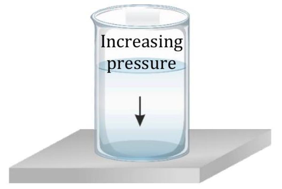Figure shows how pressure changes with depth. At the top of the glass filled with water, the water pressure is zero because there is no column of water above that level. Pressure in the middle of the glass depends on the column of water from the top of the glass to the middle of the glass. Pressure at the bottom depends on the entire height of the water. Pressure increases with depth because the column of water pushing down becomes taller and heavier.