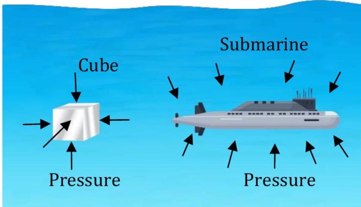 Figure shows that the fluid exerts pressure on each face of the cube or from all sides of a submarine, not just on their tops. This pressure is perpendicular to the surface, and the amount of pressure depends only on the depth in the fluid.