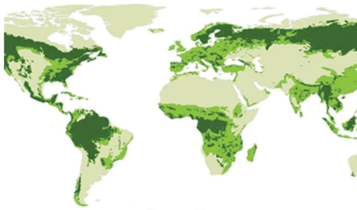About one-third of the world's land surface is covered with forests. Forests are different from one another depending upon where they are located. Climate, topography (physical features) and soil type are some of the main factors that determine the type of trees and animals that grow and thrive in a forest. The current forest cover of the world is shown in the figure given below.