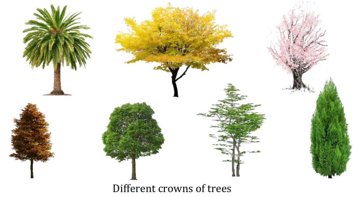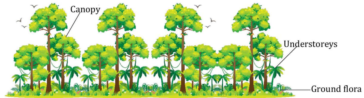 Such a shaded forest floor provides habitat for the growth of mosses, lichens and other shadeloving plants. The branches of trees in a dense forest form a cover or roof over the other plants in the forest. Such a cover or roof formed by the tree branches in the upper regions is called a canopy. The branchy part of a tree above the stem is known as the crown of the tree. Shapes and size of the crown differs in different trees. Based on the height of trees, different horizontal layers are created in the forest.