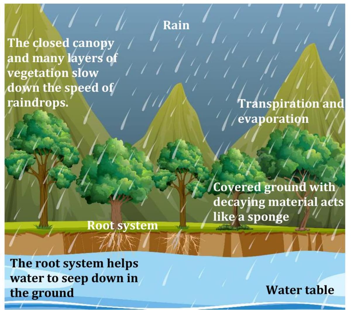 (i) They are the main sources of food to all living beings, as the plants are the producers of food. (ii) They also provide us wood, fuel, clothing (fibre), shelter, medicines, paper, rubber, vegetable oil and many other useful things. (iii) They provide home and protection to wildlife. (iv) They regulate earth's temperature and water cycle. (v) Forests help in bringing good rainfall. (vi) Plants help to purify water in the soil. Roots allow slow movement of water in the soil. The gradual movement of water helps in its purification. (vii) They help in regulating the balance of and in the atmosphere and check global warming. This is because plants release oxygen and use during the day through the process of photosynthesis. (viii) They check air pollution and contribute to purification of air. (ix) They prevent erosion of soil by water and wind. Roots of trees bind the soil together. (x) They save the hill slopes from landslides. (xi) They reduce the intensity of floods. If trees are not present, rain hits the ground directly and may flood the area around. Forest acts as a natural absorber of rainwater and allows it to seep down in the soil through the roots. Forests thus also help in maintaining the water table. (xii) Forests not only help in controlling floods but also help in maintaining the flow of water in the streams so that we get a steady supply of water. (xiii) They are a source of recreation and tourism. (xiv) Forests also control the noise pollution. The trees absorb the noise of the nearby traffic.