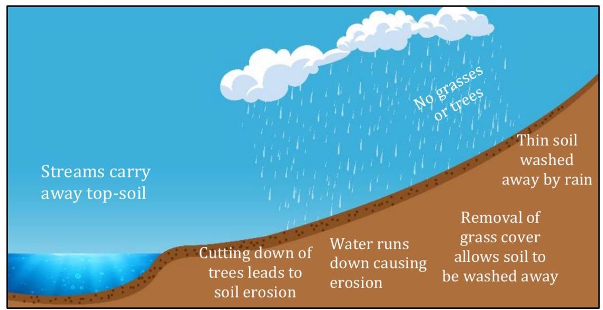 We have learnt how forests are important to all living beings on the Earth. But what if these forests get destroyed? With the increase in human population, there have been ever-rising demands for converting forests into residential and agriculture areas. As a result, lots of trees are being felled and forests have been cleared, thus destroying the habitat of several species of animals and plants. Such large-scale falling of trees is called deforestation. Deforestation is the permanent destruction of forests and woodlands. (i) If forests get destroyed, global climate and local weather may change drastically. This will result in the loss of many species of animals and plants and biological diversity. (ii) Large amounts of greenhouse gases such as carbon dioxide are released into the atmosphere due to deforestation. (iii) Natural resources such as timber, medicinal plants, fruits and nuts are depleted due to deforestation. (iv) Deforestation can cause severe flooding, soil erosion, landslide, etc., affecting our day-to-day life. Our forests need to be protected from further depletion.