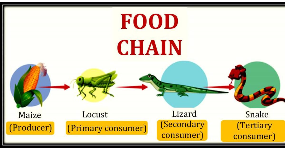 Food chain and food web: All animals depend on plants for food directly or indirectly. For example, a rat eats grains and plants, a snake eats a rat, which is in turn eaten by an eagle. It is like a chain that exists in nature. Such a chain is called a food chain. Green plants are called the producers as they can produce their own food. Animals are called consumers since they cannot produce their own food and depend on plants and other animals for food.
