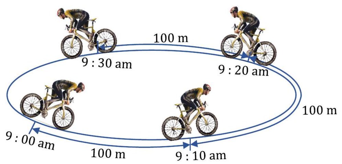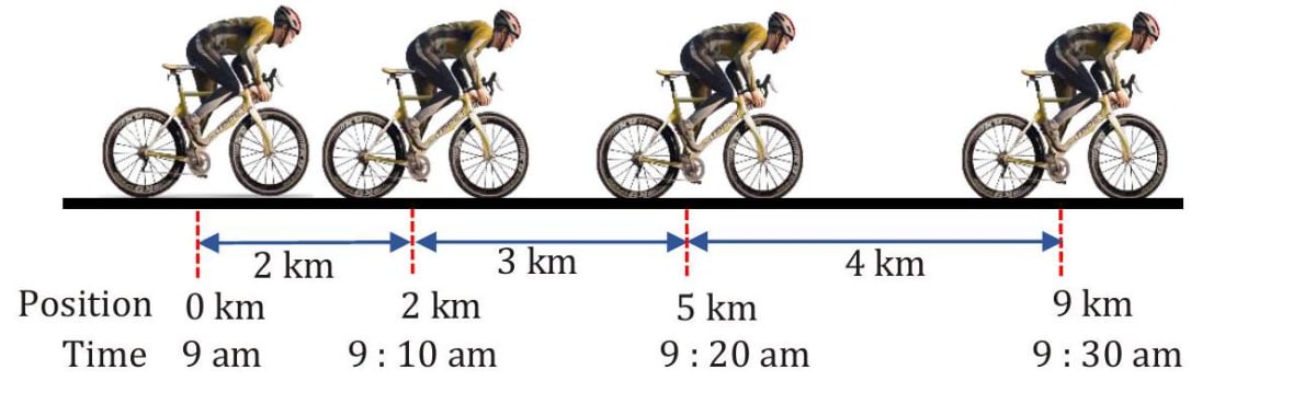 Motion of this cyclist is uniform motion, she is covering equal distances in equal intervals of time, she is moving in straight line in a particular direction.
