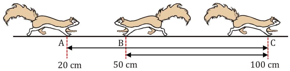 In figure, a squirrel runs on the ground from the 20 cm mark (its initial position) to the 100 cm mark. After that, it reverses and runs to the 50 cm mark (its final position). Find the displacement and distance travelled by the squirrel.