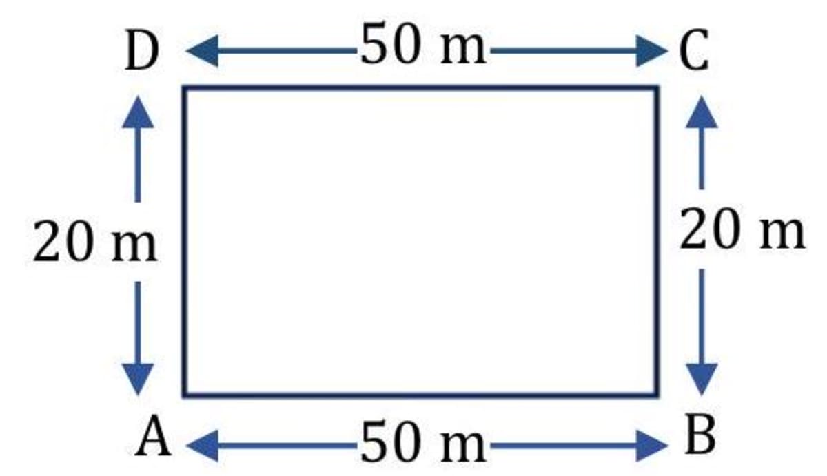 A runner travels around rectangle track with length 50 m and width 20 m . After travels around rectangular track he return back to starting point. How much distance he travelled?