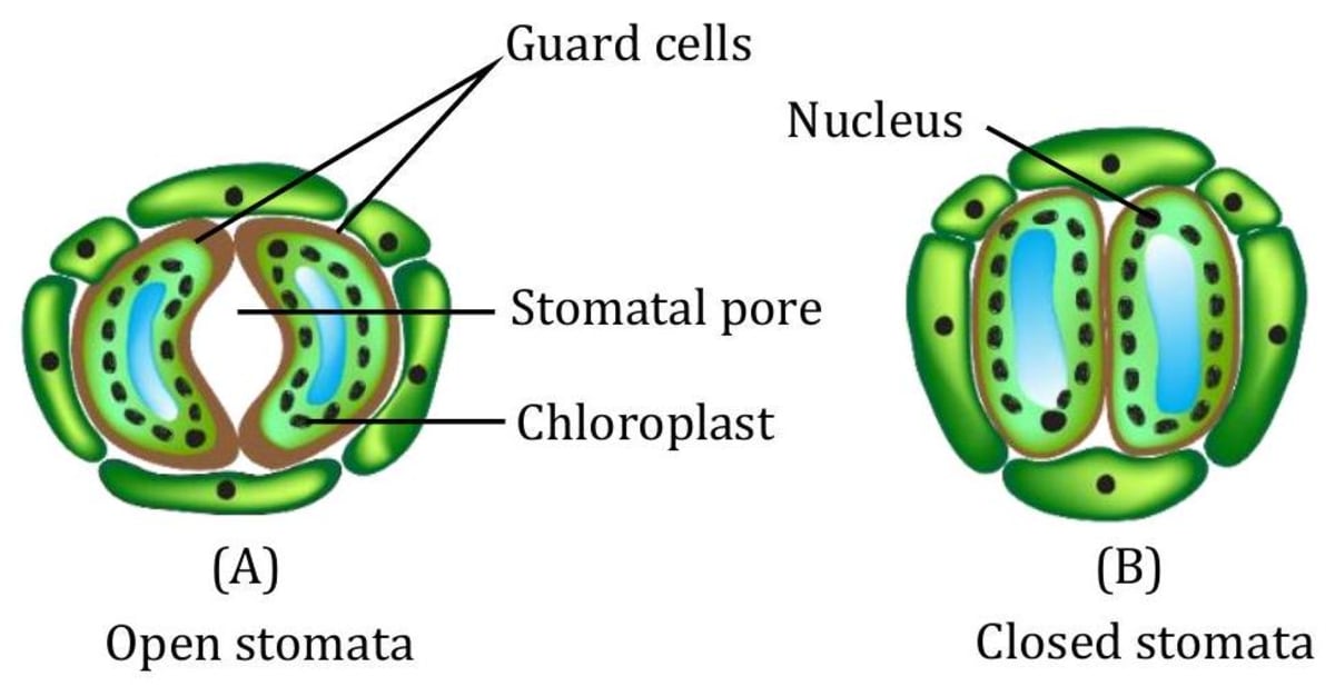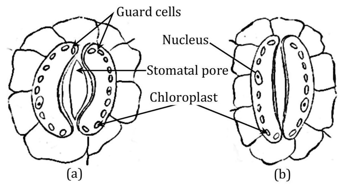 These are tiny pores or microscopic aperture guarded by two kidneys shaped or bean shaped guard cells. Stomata are present on the surface of the leaves.