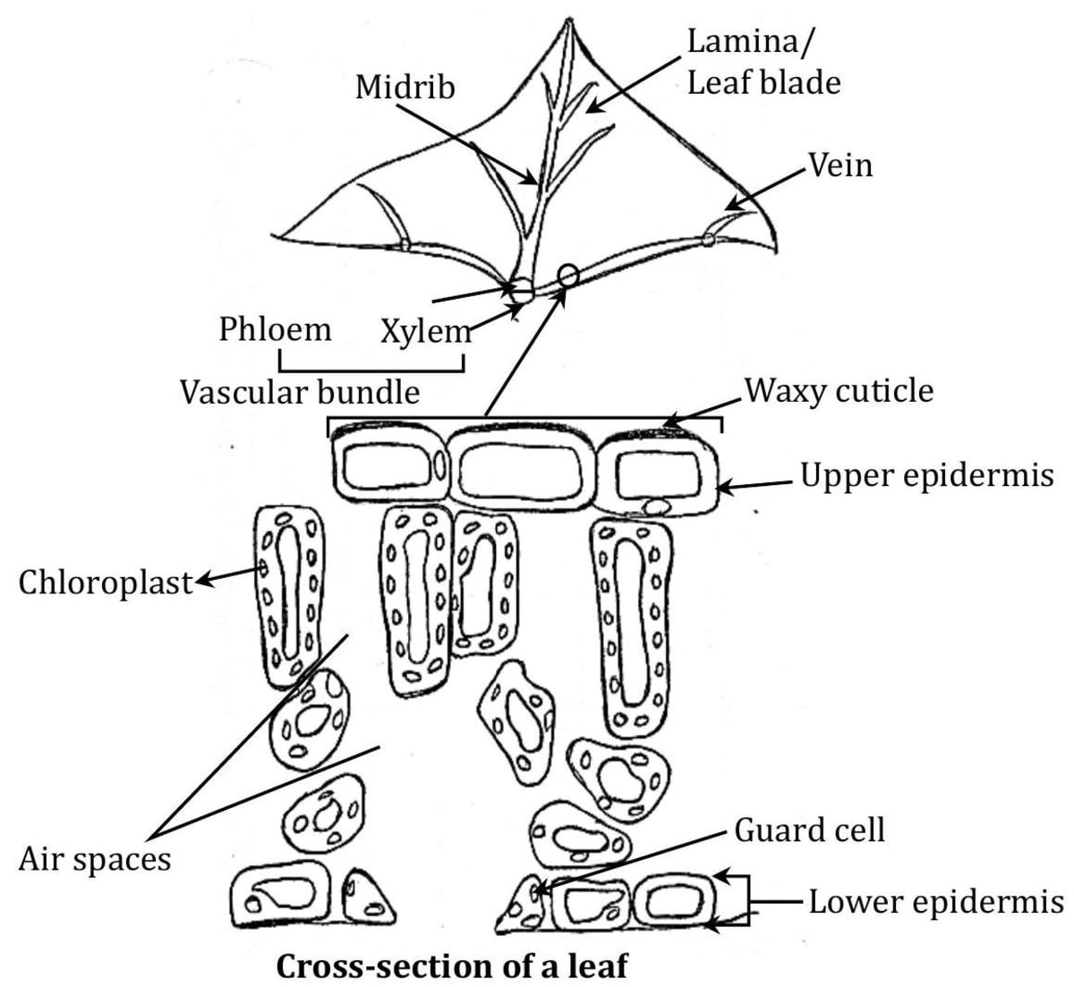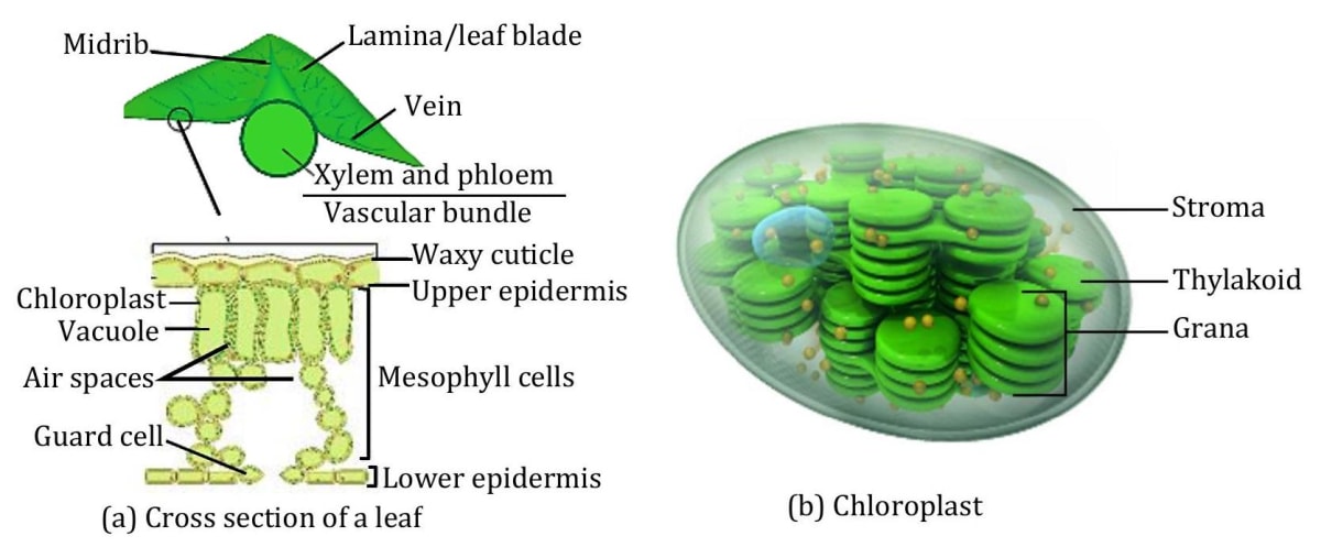 When we observe the cross section of a leaf under microscope, we can see the mesophyll cells full of green dots. These green dots are chloroplasts containing chlorophyll pigments.