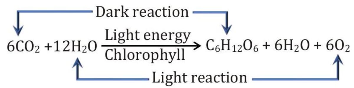 During photosynthesis following events occur (i) Absorption of light energy by chlorophylls. (ii) Conversion of light energy into chemical energy and splitting of water molecule into hydrogen and . (iii) Hydrogen reduces and synthesis of glucose (reduction of into carbohydrates) occurs.