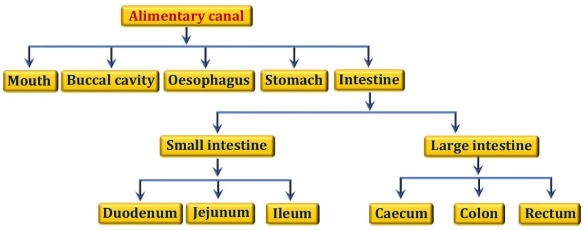 The alimentary canal is basically a long tube extending from the mouth to the anus. It is differentiated into following parts.