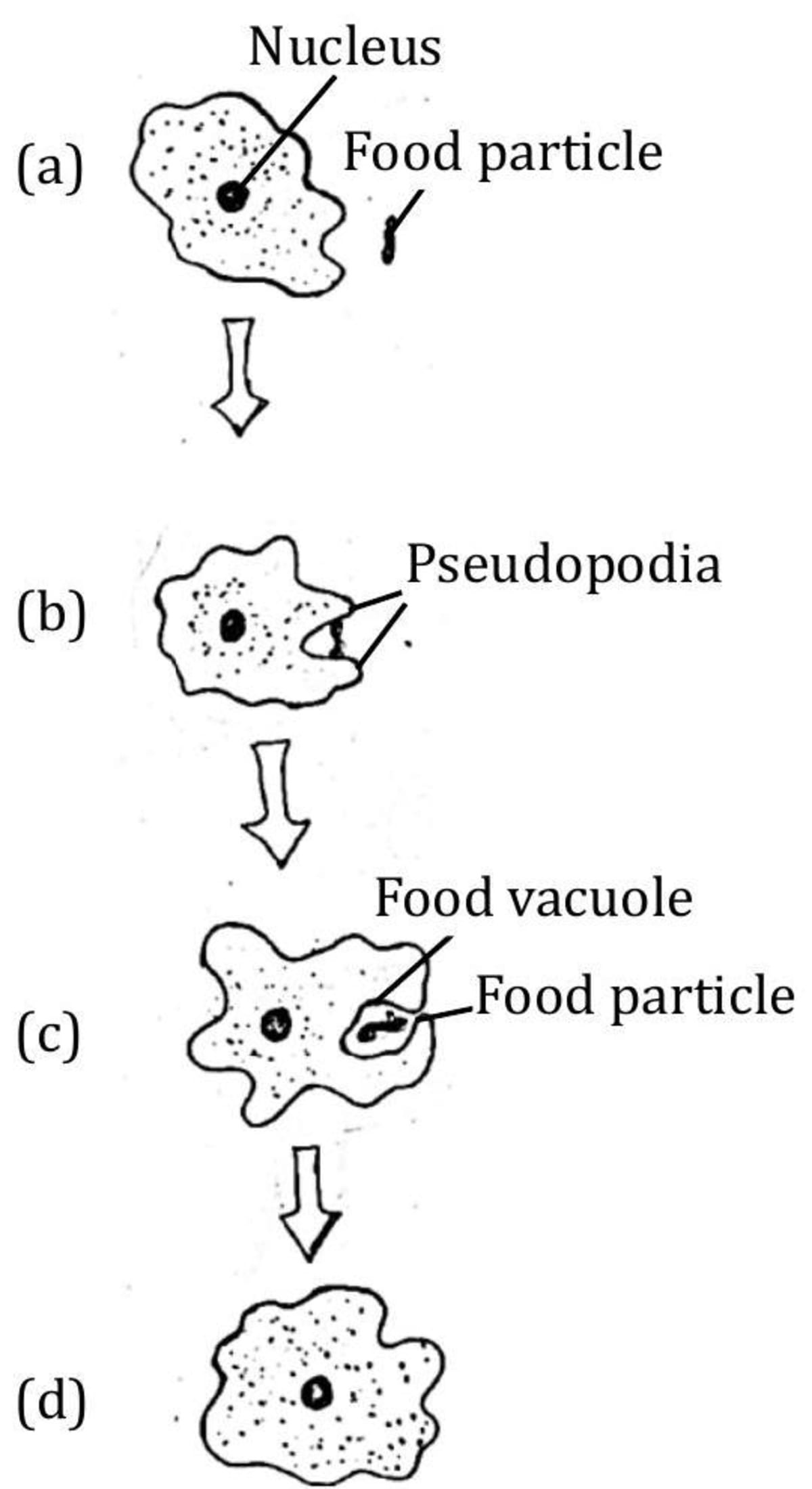 (ii) When the tips of encircling pseudopodia touch each other, the food is encaptured into a bag called food vacuole. The food vacuole serves as a temporary stomach secreting digestive juices.