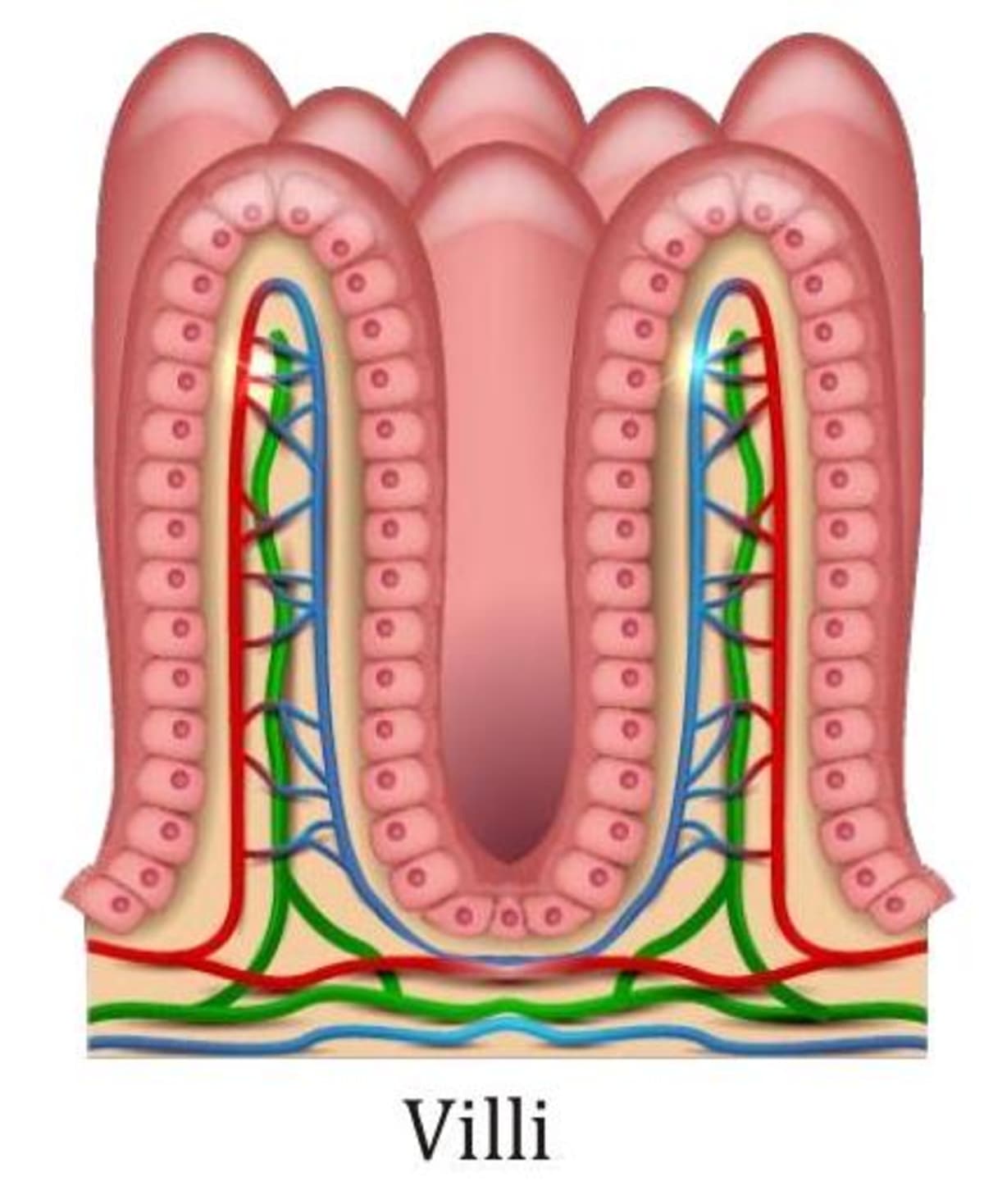 The inner lining of the small intestine has numerous fingers like projections called villi which increase the surface area for absorption of digested food. These are richly supplied with blood vessels which take the absorbed food to each and every cell of the body where it is assimilated for various purposes. The length of small intestine differs in various animals depending on the food they eat. Herbivores eating grass need a longer small intestine to allow the cellulose to be digested. Meat is easier to digest hence carnivores like tiger have a shorter small intestine.