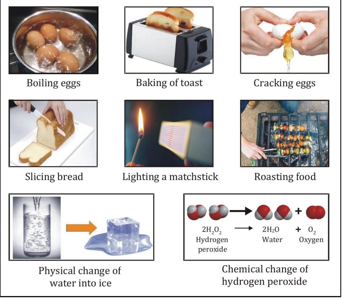 (i) Rusting of iron. (ii) Mixing an acid with a base, producing water and salt. (iii) Photosynthesis - a process in which carbon dioxide and water are changed into sugars by plants. (iv) Digestion of food. (v) Cooking examples: popcorn, cake, pancakes and eggs. (vi) Frying an egg. (vii) Lighting a matchstick. (viii) Mixing of chemicals. (ix) Rotting of fruit. (x) Explosion of fireworks.