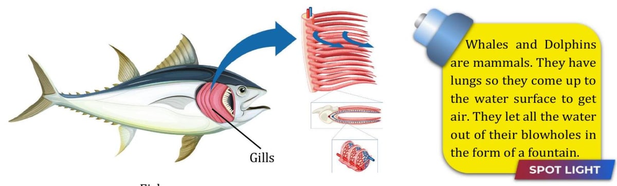 Gills are projections of the skin and they help in breathing in fishes. Gills are well supplied with blood vessels for exchange of gases.
