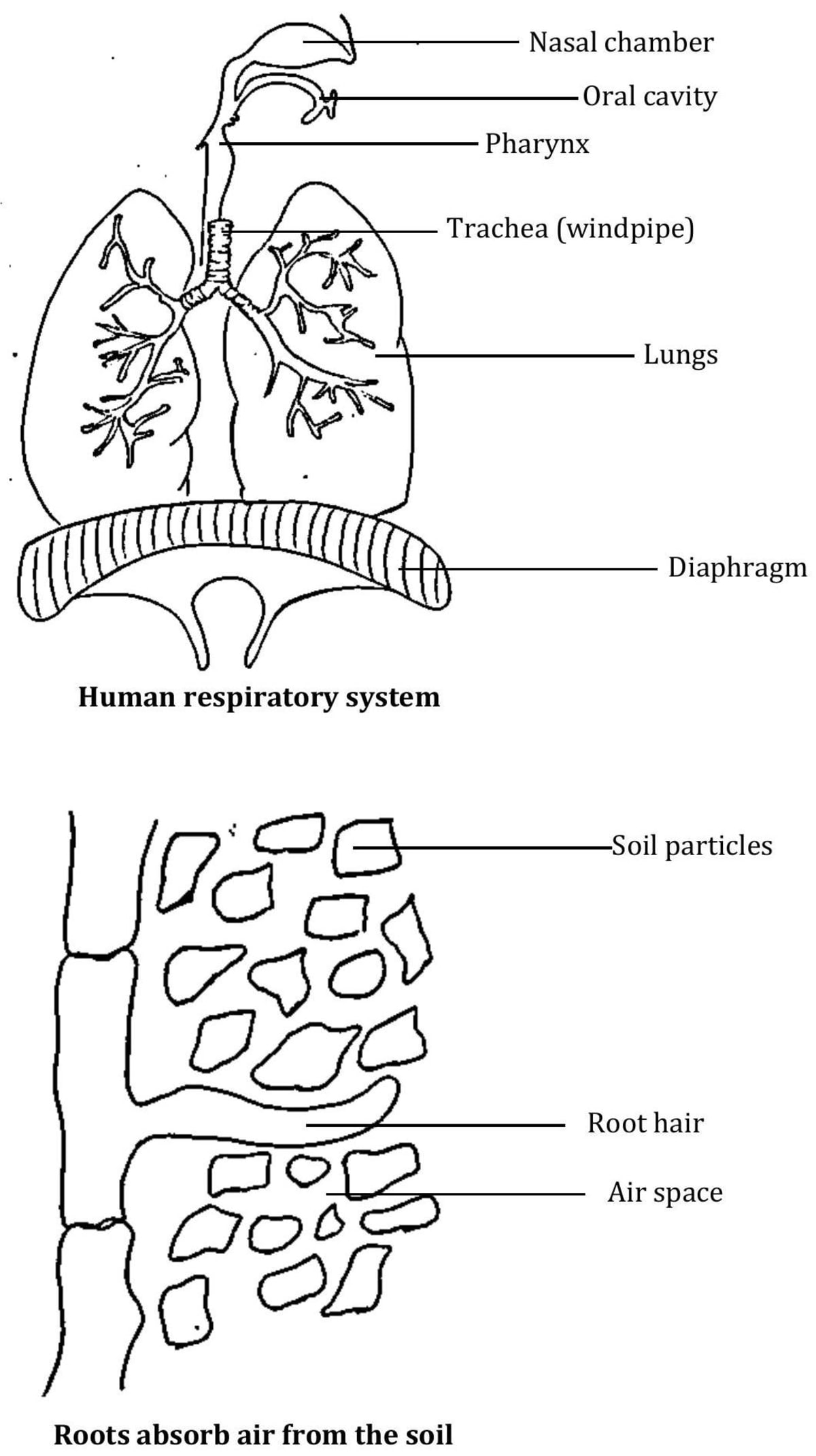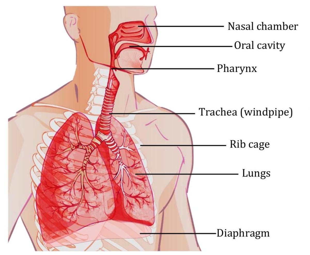 When we inhale air, it passes through our nostrils into the nasal cavity. From the nasal cavity, the air reaches our lungs through the windpipe. Lungs are present in the chest cavity. This cavity is surrounded by ribs on the sides. A large, muscular sheet called diaphragm forms the floor of the chest cavity. Breathing involves the movement of the diaphragm and the rib cage.