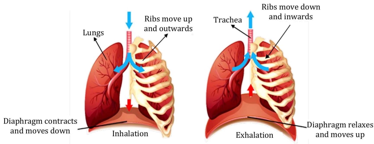 During inhalation, ribs move up and outwards and diaphragm moves down. This movement increases space in our chest cavity and air rushes into the lungs. The lungs get filled with air. During exhalation, ribs move down and inwards, while diaphragm moves up to its former position. This reduces the size of the chest cavity and air is pushed out of the lungs. These movements in our body can be felt easily.
