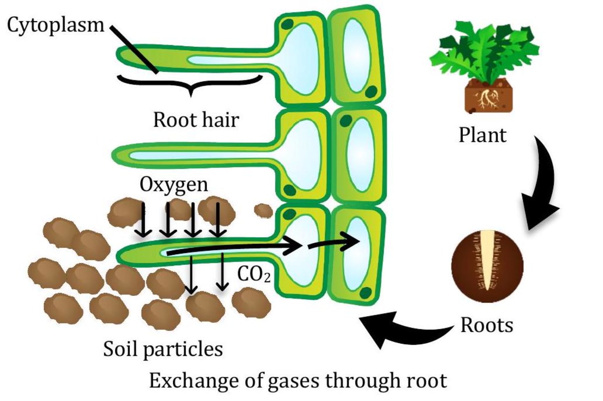 The roots take up oxygen from the air spaces present between the soil particles. In aquatic plants, gases diffuse through the body surface.