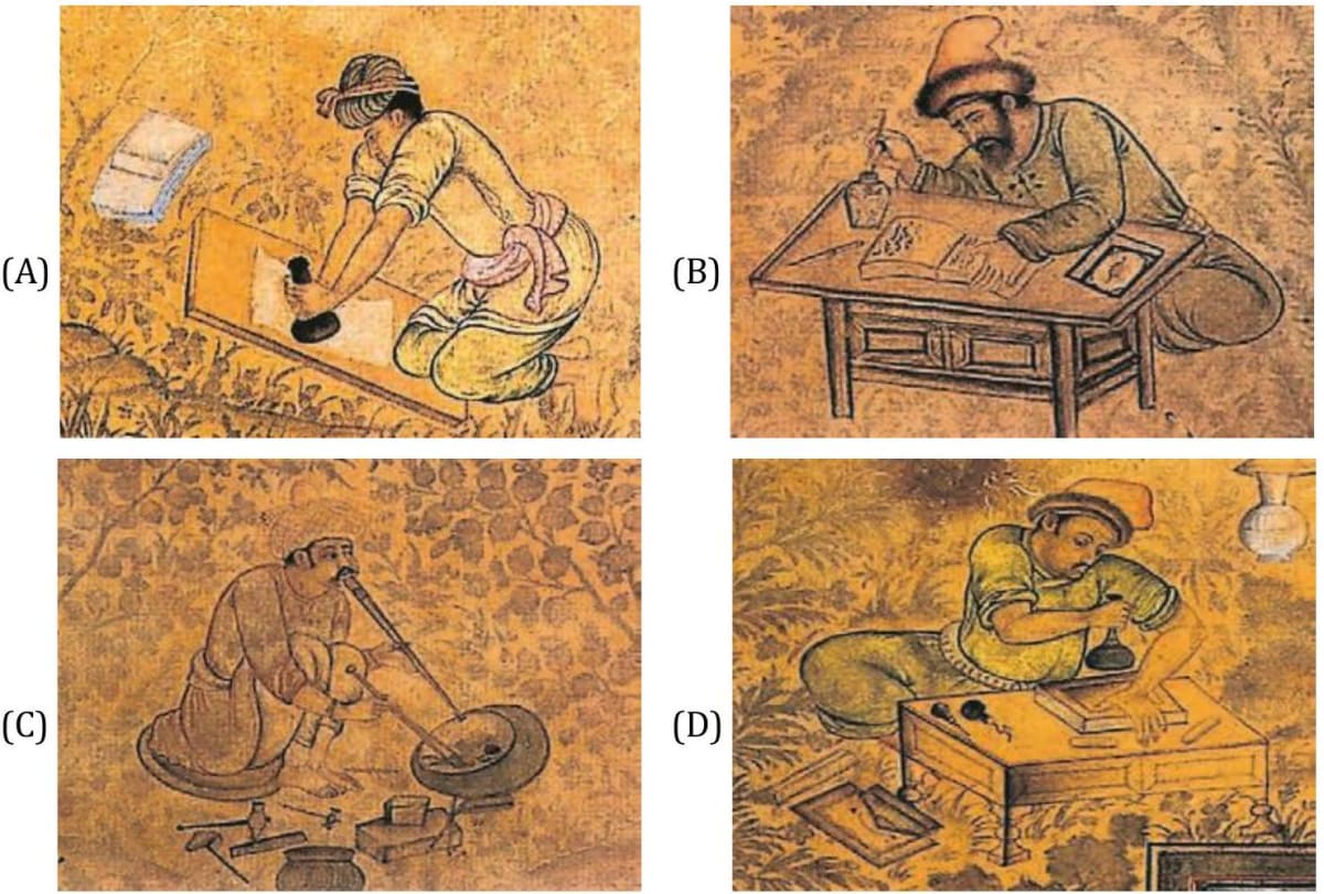 Four stages in the making of a manuscript: A. Preparing the paper. B. Writing the text. C. Melting gold to highlight important words and passages. D. Preparing the binding.