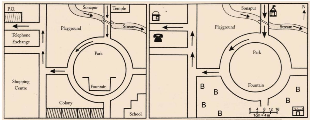 -A sketch is a drawing mainly based on memory and spot observation and not to scale. -Sometimes a rough drawing is required of an area to tell where a particular place is located with respect to other places. -Suppose,you want to go to your friend's house,but you don't know the way. -Your friend may make a rough drawing to show the way to his house. -Such a rough drawing is drawn without scale,and is called a sketch map.