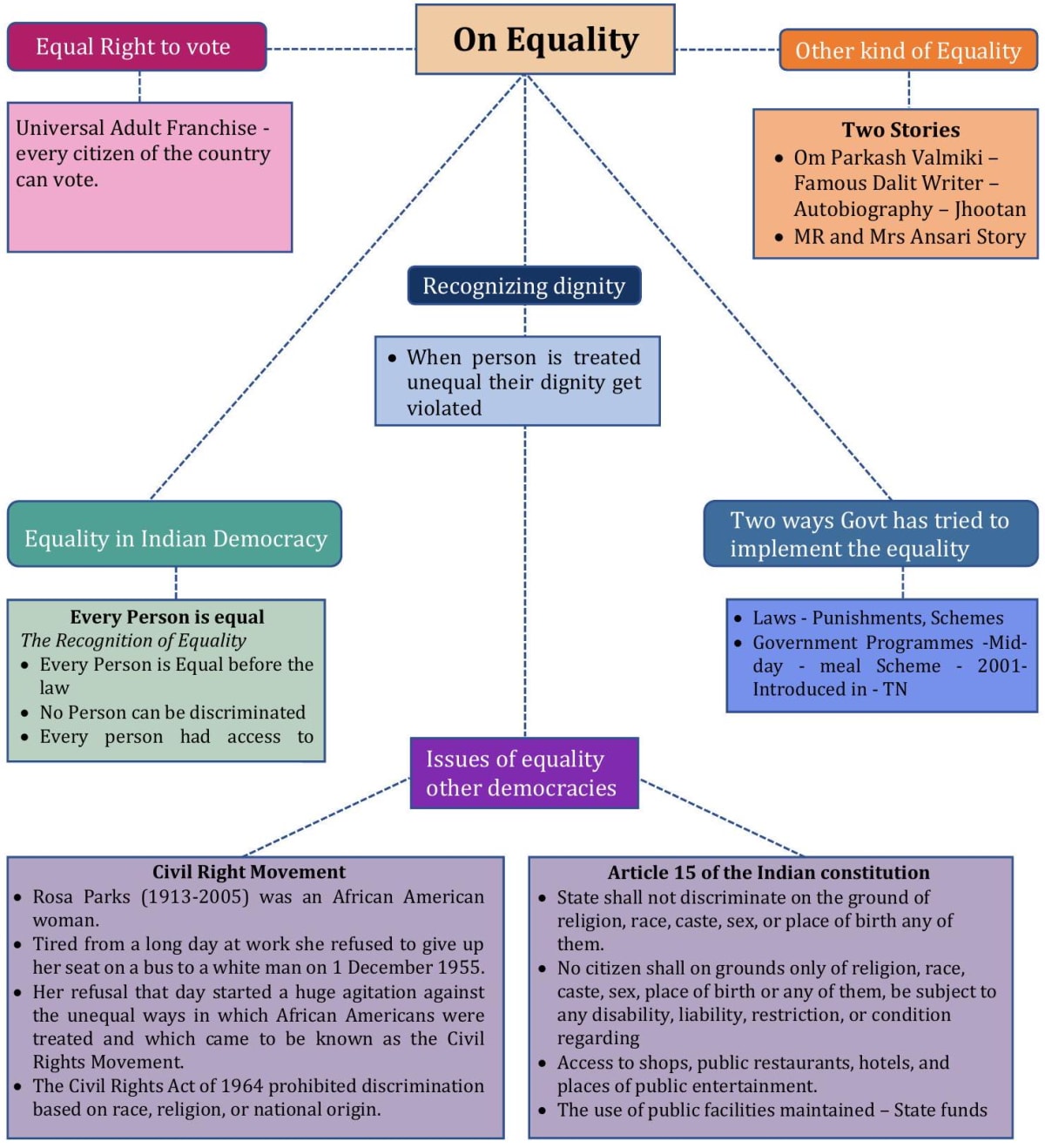 Equality is a key feature of democracy and influences all aspects of its functioning. In this chapter we will read more about equality - what it is, why it is important in a democracy, and whether or not everyone is equal in India.